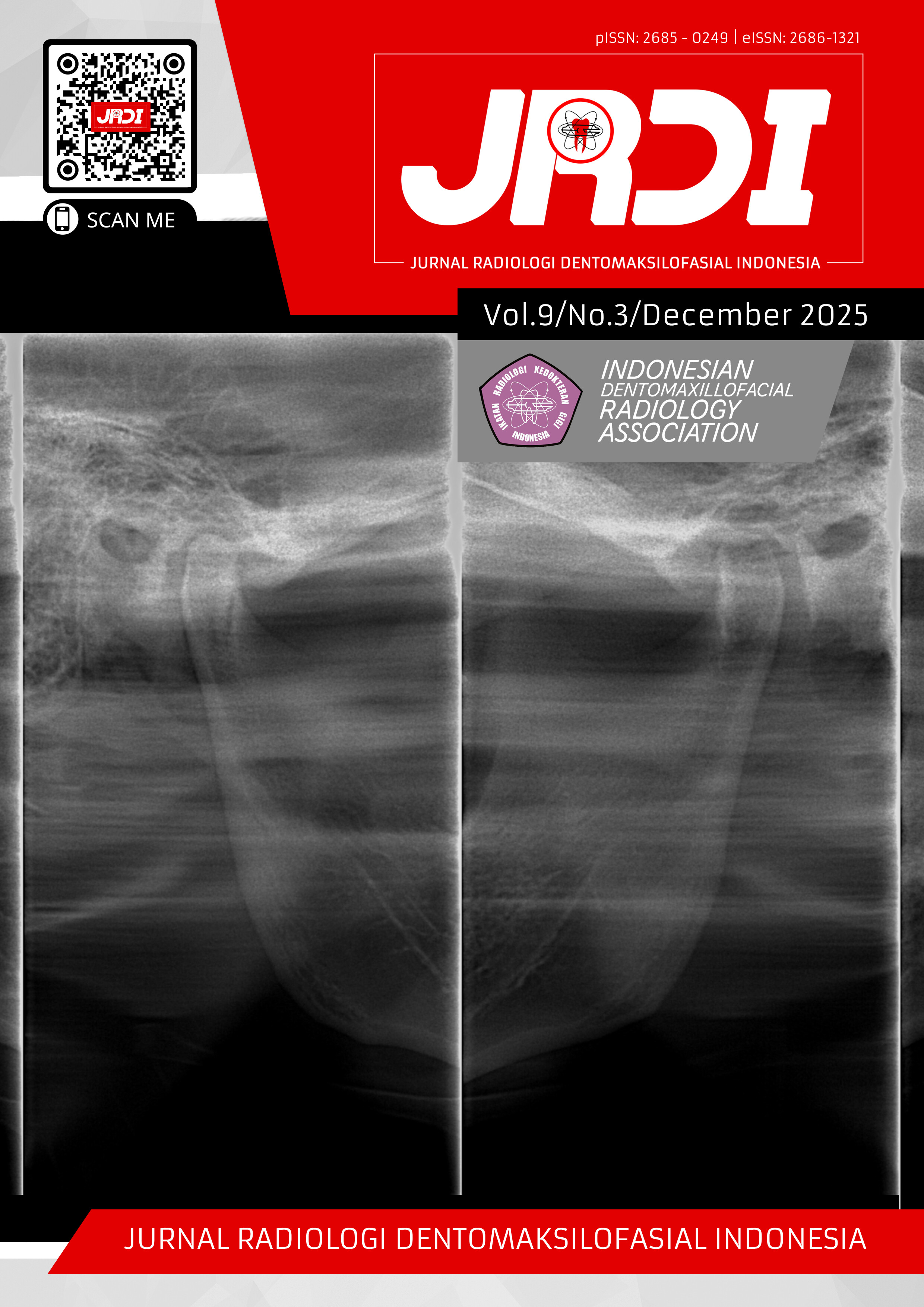 Jurnal Radiologi Dentomaksilofasial Indonesia (JRDI) | p-ISSN 2685-0249 e-ISSN 2686-1321 DOI 10.32793/jrdi is an official scientific publication which contains manuscripts particularly in the area of Dentomaxillofacial Radiology, published by Ikatan Radiologi Kedokteran Gigi Indonesia (IKARGI) / Indonesian Association of Dentomaxillofacial Radiology, under the supervision of Persatuan Dokter Gigi Indonesia / Indonesian Dental Association. Published thrice a year, every April, August, and December. The submission process opens throughout the year... Read More